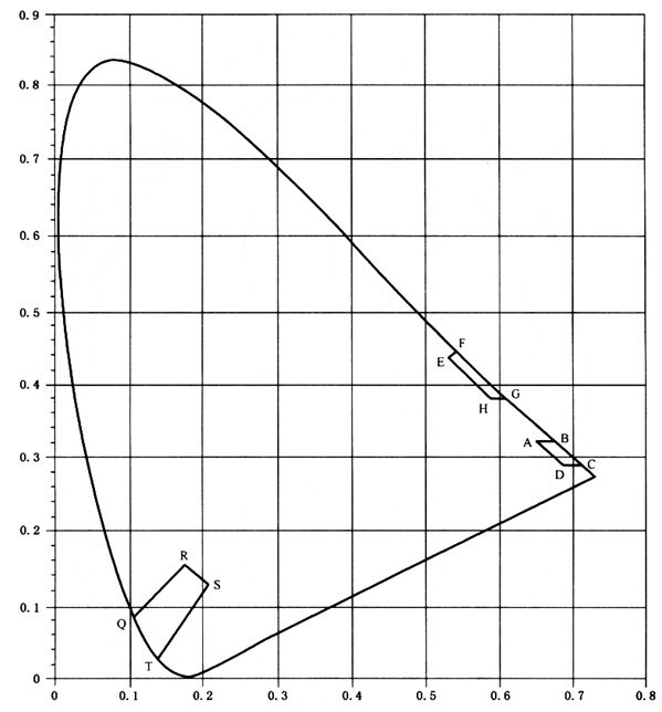 標(biāo)志燈具燈光顏色色品圖見A.1。圖A.1是在CIE1931色度圖上畫出的紅色、黃色、藍(lán)色光信號顏色的色度區(qū)域。