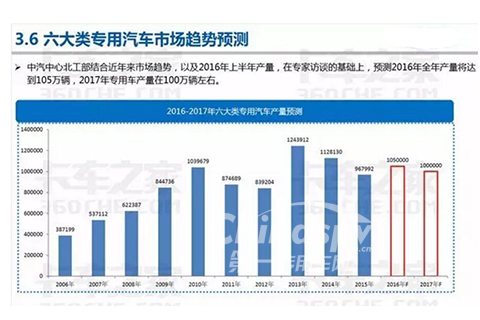 中期中心北工部結(jié)合近年來市場趨勢,以及2016年上半年產(chǎn)量,在專家訪談基礎(chǔ)上,預(yù)測2016年全年產(chǎn)量將達到105萬輛,2017年專用車產(chǎn)量在100萬輛左右。
