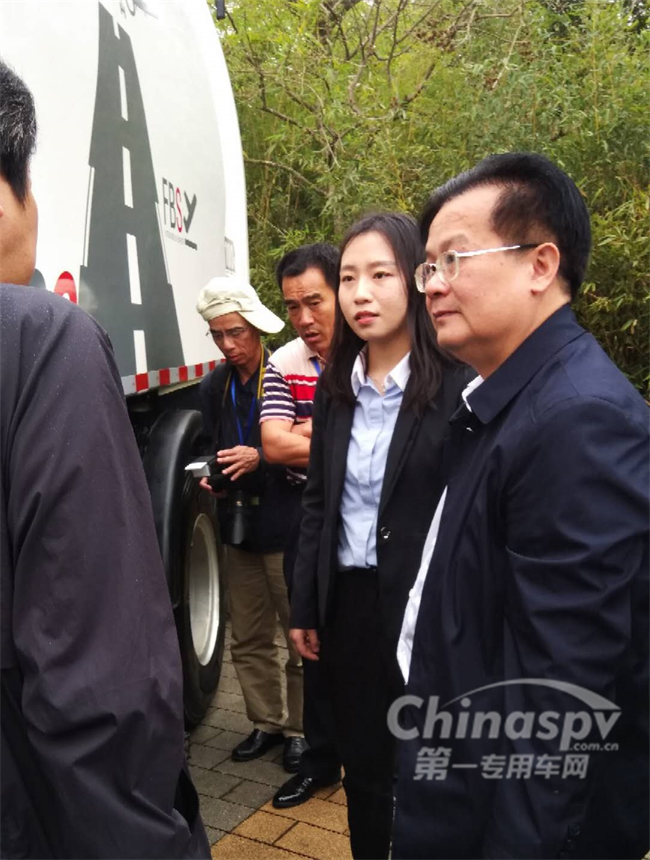 南寧市城市管理局局長(zhǎng)梁勇(右一)聽取車型介紹