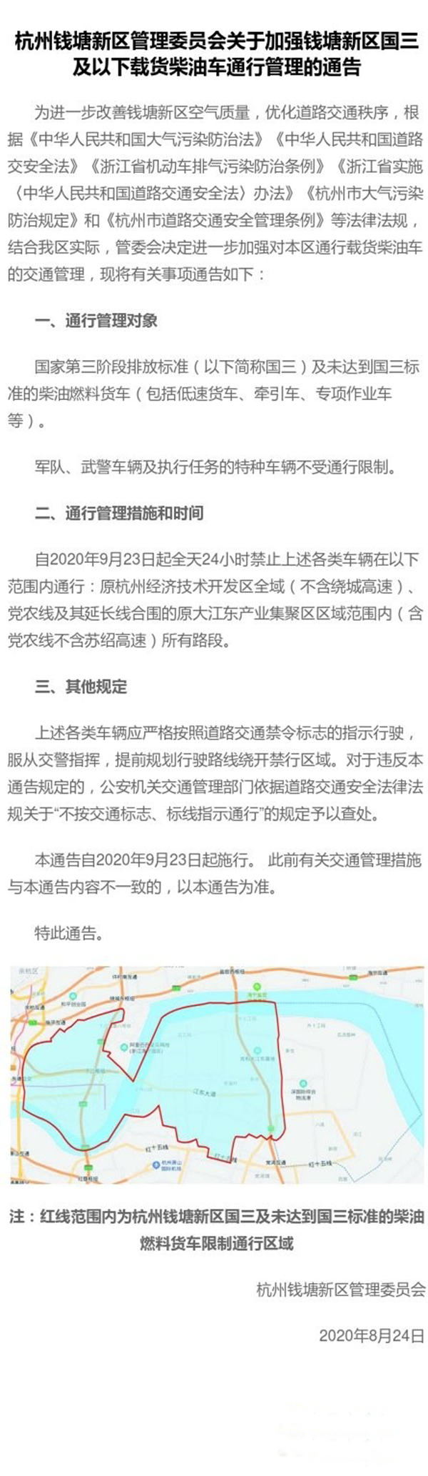 2020年9月23日起,國三及未達(dá)到國三標(biāo)準(zhǔn)的柴油燃料貨車全天24小時(shí)禁止在原杭州經(jīng)濟(jì)技術(shù)開發(fā)區(qū)全域(不含繞城高速)、黨農(nóng)線及其延長線合圍的原大江東產(chǎn)業(yè)集聚區(qū)區(qū)域范圍內(nèi)(含黨農(nóng)線不含蘇紹高速)所有路段通行,具體詳見: