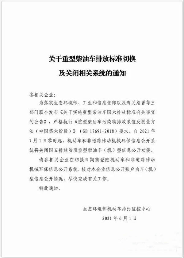 2021年6月1日,為落實(shí)生態(tài)環(huán)境部、工業(yè)和信息部以及海關(guān)總署等三部門聯(lián)合發(fā)《關(guān)于實(shí)施重型柴油車國六排放標(biāo)準(zhǔn)有關(guān)事宜的公告》,嚴(yán)格執(zhí)行《重型柴油車國六排放標(biāo)準(zhǔn)有關(guān)事宜的公告》,嚴(yán)格執(zhí)行《重型柴油車污染物排放限值及測量方法(中國第六階段)》(GB 17691-2018)要求,自2021年7月1日零時(shí)起,機(jī)動車和非道路移動機(jī)械環(huán)保信息公開系統(tǒng)將關(guān)閉國五排放階段重型柴油機(jī)車(機(jī))型信息公開功能。