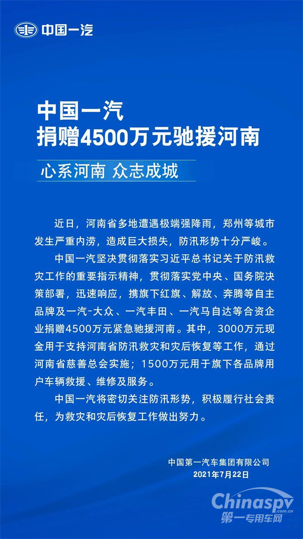 中國(guó)一汽堅(jiān)決貫徹落實(shí)習(xí)近平總書(shū)記關(guān)于防汛救災(zāi)工作的重要指示精神,貫徹落實(shí)黨中央、國(guó)務(wù)院決策部署,迅速響應(yīng),攜旗下紅旗、解放、奔騰等自主品牌及一汽-大眾、一汽豐田、一汽馬自達(dá)等合資企業(yè)捐贈(zèng)4500萬(wàn)元緊急馳援河南。其中,3000萬(wàn)元現(xiàn)金用于支持河南省防汛救災(zāi)和災(zāi)后恢復(fù)等工作,通過(guò)河南省慈善總會(huì)實(shí)施;1500萬(wàn)元用于旗下各品牌用戶(hù)車(chē)輛救援、維修及服務(wù)。