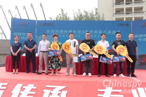 活動現(xiàn)場廣大客戶積極搶購,隨車吊、低平板合計簽約計110臺,并舉行金鑰匙交付儀式,贈送東風(fēng)天錦KR車模。