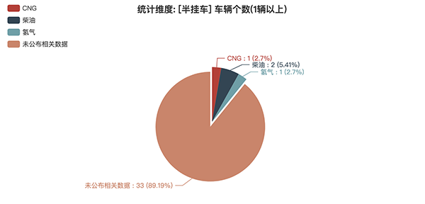 本次公告中的37款半掛車中,CNG(1輛,占比2.7%)、柴油(2輛,占比5.41%)、氫氣(1輛,占比2.7%)、未公布相關(guān)數(shù)據(jù)(33輛,占比89.19%)。