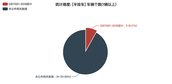 本次公告中的37款半掛車中,GB17691-2018國(guó)Ⅵ(3輛,占比8.11%)、未公布相關(guān)數(shù)據(jù)(34輛,占比91.89%)。