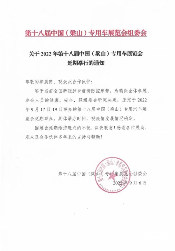 2022年9月6日第一專用車網(wǎng)記者獲悉,鑒于近期疫情防控形勢(shì)嚴(yán)峻,為了確保展商和觀眾的安全以及展會(huì)效果,原定于2022年9月17-19日舉辦的第十八屆中國(guó)(梁山)專用汽車展覽會(huì)延期舉辦,具體舉辦時(shí)間另行通知。