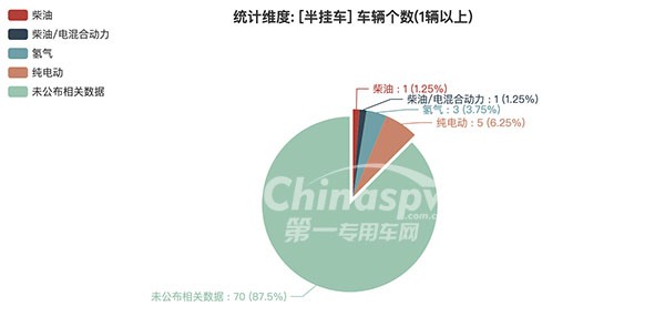 本次公告中的80款半掛車(chē)中,柴油(1輛,占比1.25%)、柴油/電混合動(dòng)力(1輛,占比1.25%)、氫氣(3輛,占比3.75%)、純電動(dòng)(5輛,占比6.25%)、未公布相關(guān)數(shù)據(jù)(70輛,占比87.5%)。