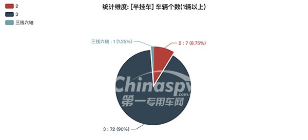 本次公告中的80款半掛車(chē)中,2軸(7輛,占比8.75%)、3軸(72輛,占比90%)、三線六軸(1輛,占比1.25%)。