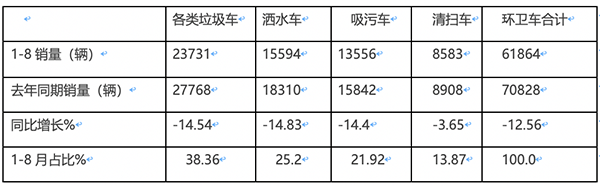 上表顯示,今年1-8月各類環(huán)衛(wèi)車銷量、同比及占比呈現(xiàn)以下特點(diǎn):