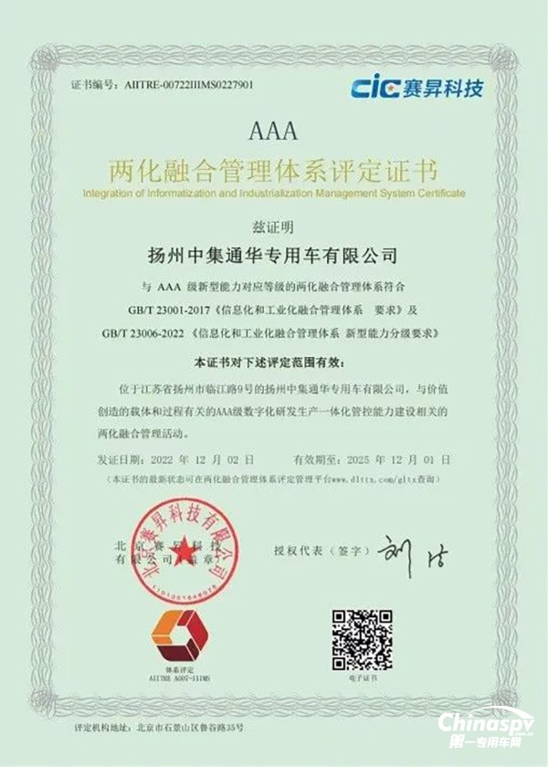 2022年12月2日,揚州中集通華專用車有限公司正式獲得國家工信部兩化融合評定機構簽發(fā)的“兩化融合管理體系AAA級評定證書”,成為國內(nèi)半掛車行業(yè)首家通過兩化融合AAA級認證的企業(yè)。