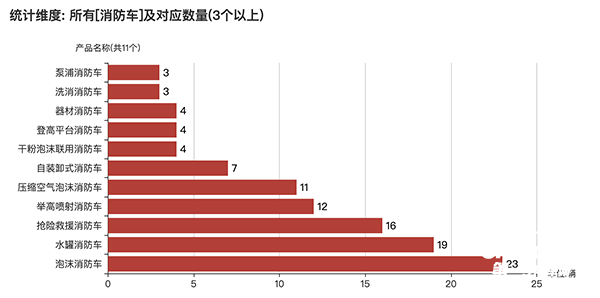 本次公告中的124款消防車共包含22種車型,泡沫消防車(23輛)、水罐消防車(19輛)、搶險(xiǎn)救援消防車(16輛)、舉高噴射消防車(12輛)、壓縮空氣泡沫消防車(11輛)、自裝卸式消防車(7輛)、器材消防車(4輛)、登高平臺(tái)消防車(4輛)、干粉泡沫聯(lián)用消防車(4輛)、洗消消防車(3輛)、泵浦消防車(3輛)、應(yīng)急保障消防車(2輛)、供液消防車(2輛)、應(yīng)急救援消防車(2輛)、供氣消防車(2輛)、照明消防車(2輛)、排煙消防車(2輛)、水帶敷設(shè)消防車(2輛)、云梯消防車(1輛)、機(jī)場(chǎng)消防車(1輛)、通信指揮消防車(1輛)、化學(xué)救援消防車(1輛)。