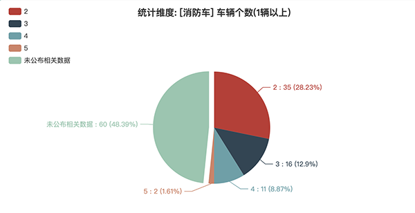 本次公告中的124款消防車中,2軸(35輛,占比28.23%)、3軸(16輛,占比12.9%)、4軸(11輛,占比8.87%)、5軸(2輛,占比1.61%)、未公布相關(guān)數(shù)據(jù)(60輛,占比48.39%)。
