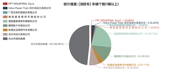 本次公告中的124款消防車中,發(fā)動(dòng)機(jī)配套情況如下:FPT INDUSTRIAL S.p.A.(1輛,占比0.81%)、Volvo Power Train沃爾沃動(dòng)力系統(tǒng)公司(3輛,占比2.42%)、廣西玉柴機(jī)器股份有限公司(1輛,占比0.81%)、德國(guó)曼恩商用車輛股份公司(1輛,占比0.81%)、德國(guó)曼恩商用車輛股份公司(27輛,占比21.77%)、戴姆勒卡車股份公司(16輛,占比12.9%)、斯堪尼亞商用汽車有限公司(5輛,占比4.03%)、沃爾沃動(dòng)力系統(tǒng)公司(10輛,占比8.06%)、未公布相關(guān)數(shù)據(jù)(60輛,占比48.39%)。
