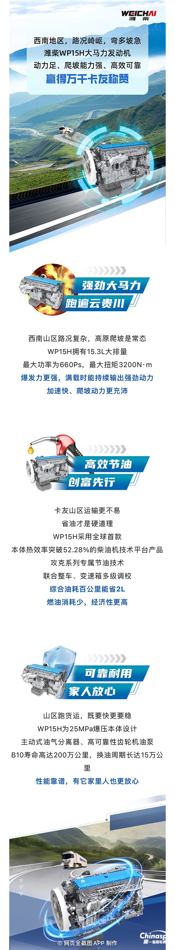 西南地區(qū),路況崎嶇,彎多坡急,濰柴WP15H大馬力發(fā)動機(jī)動力足、爬坡能力強(qiáng)、高效可靠,贏得萬千卡友稱贊。