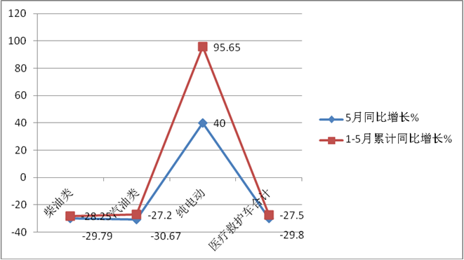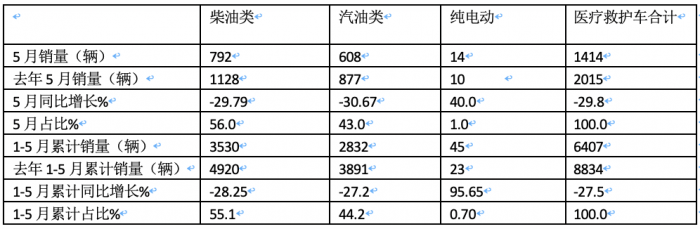 特點一、同比增幅創(chuàng)近年新低前5月醫(yī)療救護車市場:同比創(chuàng)新低純電動領漲、5-6米最“受寵”?