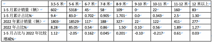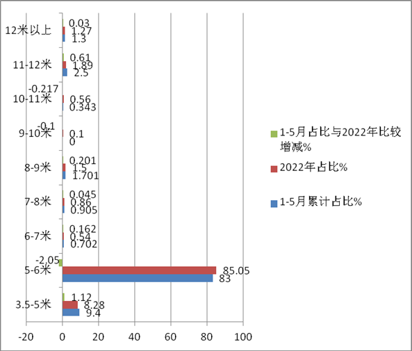 上圖表顯示,在今1-5月按長度段劃分,各個長度段救護車銷量占比呈現(xiàn)以下特點: