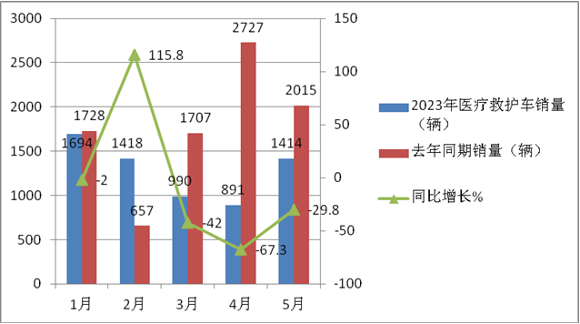2023年1-5月各月醫(yī)療救護車銷量及同比(數(shù)據(jù)來源:終端上牌信息)