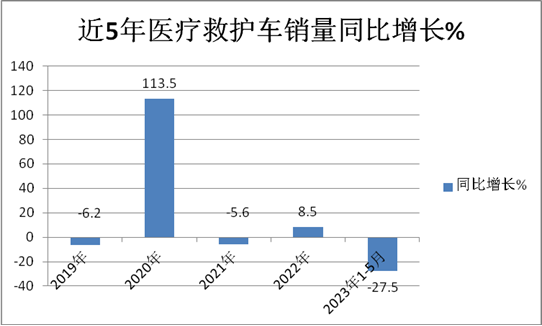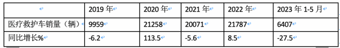 根據(jù)終端上牌信息,2023年1-5月醫(yī)療救護車累計銷售6407輛,同比增長-27.5%,其同比增幅創(chuàng)下近年新低(表1).