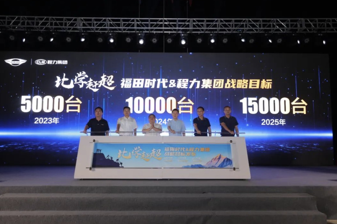 對(duì)標(biāo)先進(jìn)“比”實(shí)戰(zhàn)、咬定目標(biāo)“學(xué)”方法、奮勇?tīng)?zhēng)先“趕”進(jìn)度、振臂一呼“超”一流。隨后由程力集團(tuán)董事長(zhǎng)程阿羅,福田汽車(chē)集團(tuán)業(yè)務(wù)副總裁、時(shí)代事業(yè)部黨委書(shū)記、總裁鞏海東,程力集團(tuán)黨委書(shū)記袁昌才,程力集團(tuán)總經(jīng)理朱武,時(shí)代事業(yè)部副總裁、瑞沃營(yíng)銷(xiāo)公司總經(jīng)理王建軍,時(shí)代事業(yè)部專(zhuān)底營(yíng)銷(xiāo)公司總經(jīng)理王小凱六位領(lǐng)導(dǎo)登臺(tái)啟動(dòng)“比學(xué)趕超——福田時(shí)代&程力集團(tuán)戰(zhàn)略目標(biāo)發(fā)布儀式”,達(dá)成福田時(shí)代&程力集團(tuán)2023年5000臺(tái)、2024年10000臺(tái)、2025年15000臺(tái)的戰(zhàn)略目標(biāo)。這一戰(zhàn)略目標(biāo)的發(fā)布是福田時(shí)代與程力集團(tuán)又一里程碑的樹(shù)立,既是堅(jiān)定奮斗的目標(biāo),也是攜手共進(jìn)的見(jiàn)證,相信在福田時(shí)代與程力集團(tuán)的共同努力下,定能穩(wěn)扎穩(wěn)打、步步為營(yíng),圓滿(mǎn)完成戰(zhàn)略目標(biāo)。