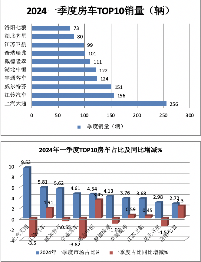 上圖表顯示,在2024年一季度房車?yán)塾嬩N量TOP10中: