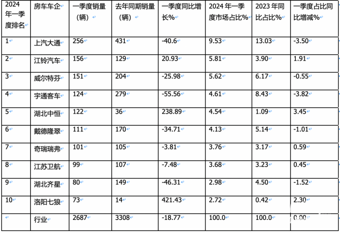 2024年一季度房車銷量特點總結(jié)分析:?實銷2687輛降18.77%,大通\江鈴\威爾特芬居前三