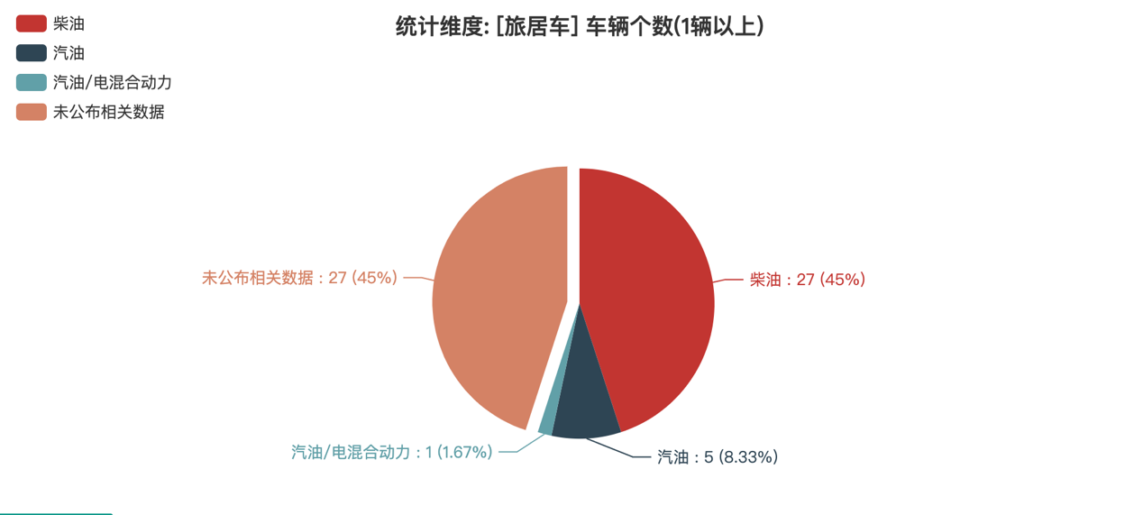 本次公告中的60款旅居車中,柴油(27輛,占比45%)、汽油(5輛,占比8.33%)、汽油/電混合動力(1輛,占比1.67%)、未公布相關數(shù)據(27輛,占比45%)。