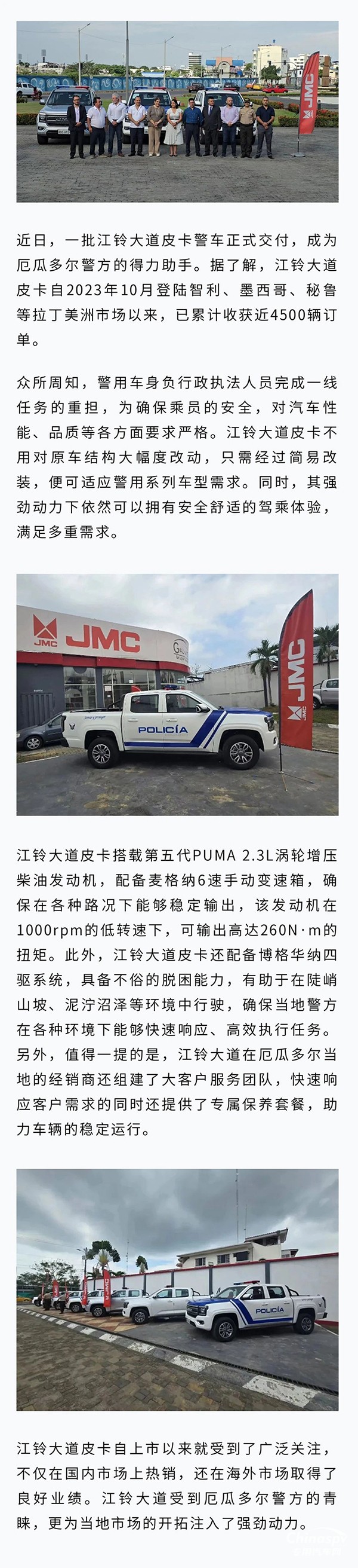 江鈴大道成功打入厄瓜多爾警用車市場(chǎng) 拉美市場(chǎng)累計(jì)4500輛訂單
