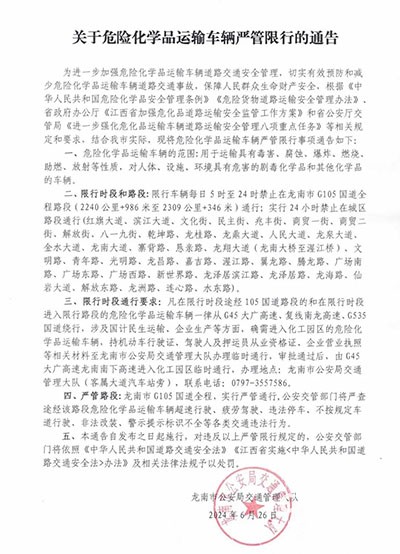 凡在限行時(shí)段途經(jīng)105國(guó)道路段的和在限行時(shí)段進(jìn)入限行路段的危險(xiǎn)化學(xué)品運(yùn)輸車輛一律從G45大廣高速、復(fù)線南龍高速、G535國(guó)道繞行,涉及國(guó)計(jì)民生運(yùn)輸、企業(yè)生產(chǎn)等方面,確需進(jìn)入化工園區(qū)的危險(xiǎn)化學(xué)品運(yùn)輸車輛,持機(jī)動(dòng)車行駛證、駕駛?cè)思把哼\(yùn)員從業(yè)資格證、企業(yè)營(yíng)業(yè)執(zhí)照等相關(guān)材料至龍南市公安局交通管理大隊(duì)辦理臨時(shí)通行,審批通過(guò)后,由G45大廣高速龍南南下高速進(jìn)入化工園區(qū)臨時(shí)通行,辦理地點(diǎn):龍南市公安局交通管理大隊(duì)(客屬大道汽車站旁),聯(lián)系電話:0797-3557586。
