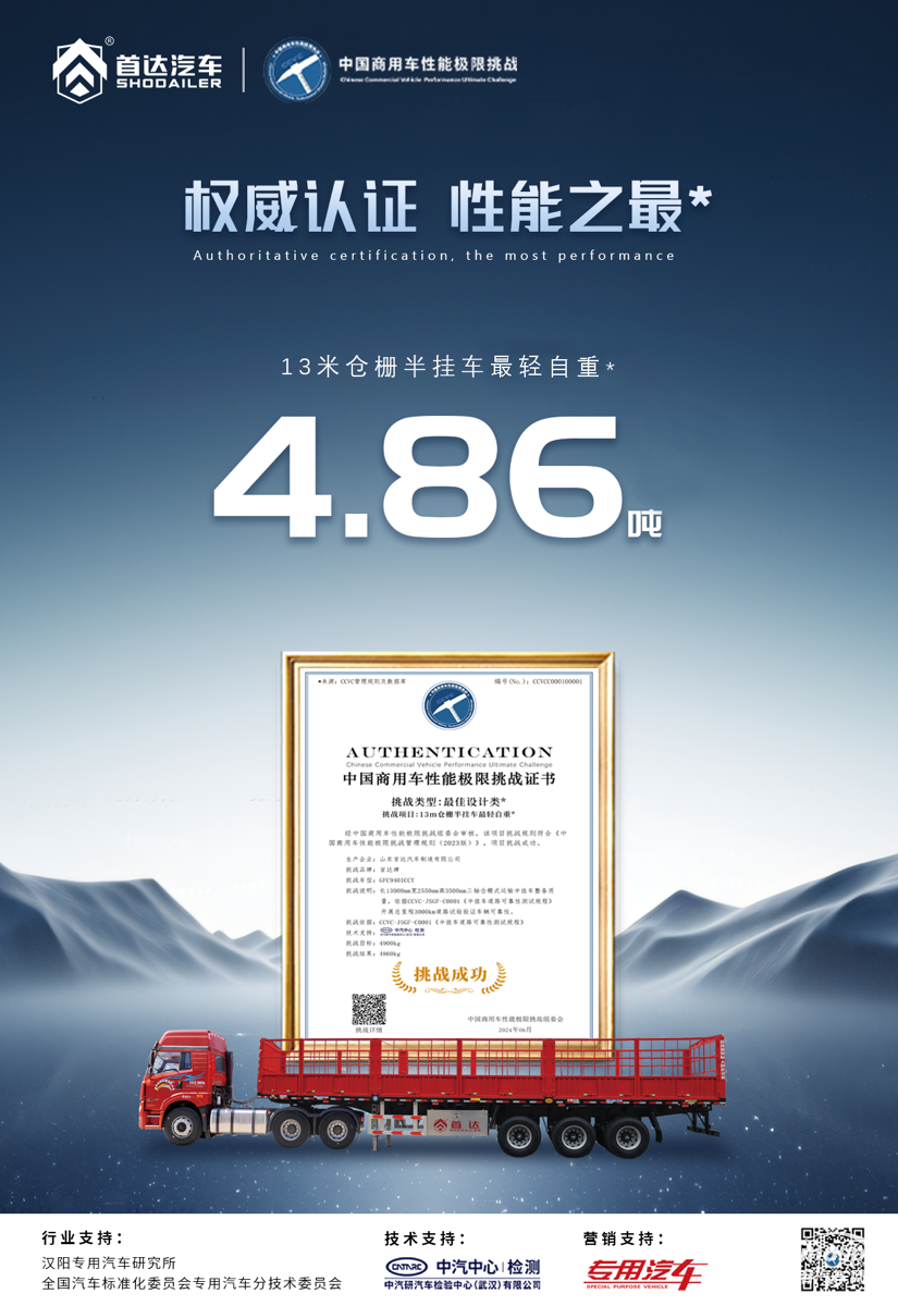 中國商用車性能極限挑戰(zhàn)組委會現(xiàn)場宣布,首達(dá)汽車的13米倉柵半掛車在“13米倉柵半掛車自重極限挑戰(zhàn)”項(xiàng)目中挑戰(zhàn)成功!