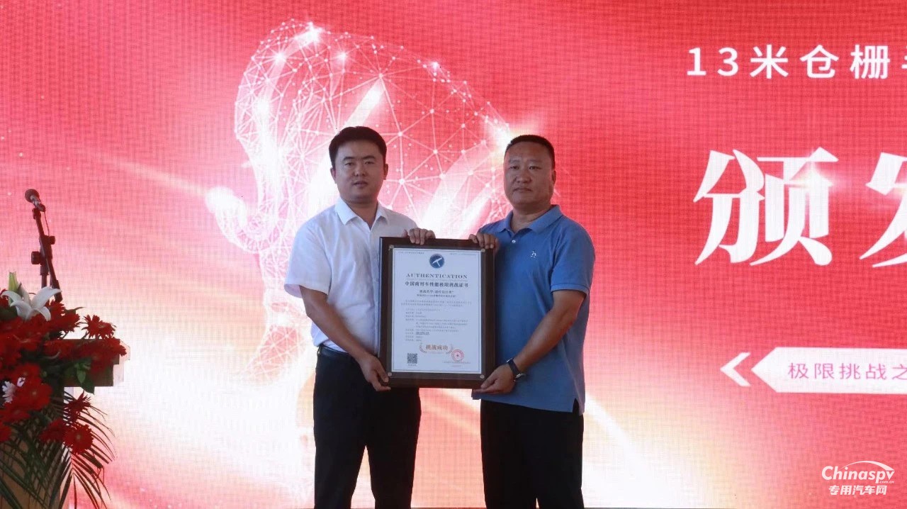 在現(xiàn)場,中國商用車性能極限挑戰(zhàn)組委會向首達(dá)汽車董事長高峰頒發(fā)了“中國商用車性能極限挑戰(zhàn)證書”。意味著首達(dá)汽車的成績是當(dāng)前CCVC數(shù)據(jù)庫最佳設(shè)計(jì)類13米倉柵半掛車最輕自重!