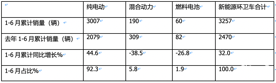 ---純電動環(huán)衛(wèi)車累計銷售3007輛,同比增長44.6%,跑贏并領漲今年1-6月新能源環(huán)衛(wèi)車大盤;