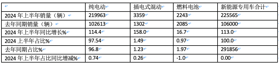 表1,2024上半年新能源專(zhuān)用車(chē)各技術(shù)路線車(chē)型銷(xiāo)量同比、占比及占比與2022年占比比較(數(shù)據(jù)來(lái)源:終端上牌):