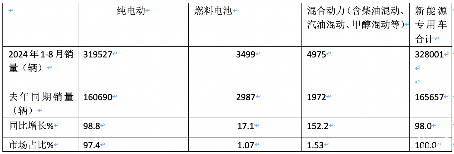 上圖表顯示,按技術路線劃分,在2024年1-8月新能源專用車銷量結構中: