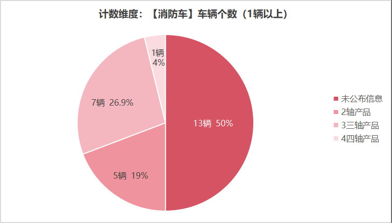 本次公告中的26款消防車中,2軸(5輛,占比19.2%)、3軸(7輛,占比26.9%)、4軸(1輛,占比3.8%)、未公布相關(guān)數(shù)據(jù)(13輛,占比50.0%)。