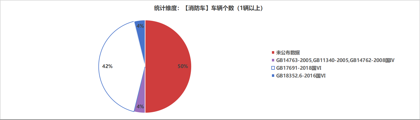 本次公告中的26款消防車中,GB14763-2005,GB11340-2005,GB14762-2008國Ⅳ(1輛,占比3.8%)、GB17691-2018國Ⅵ(11輛,占比42.3%)、GB18352.6-2016國Ⅵ(1輛,占比3.8%)、未公布相關(guān)數(shù)據(jù)(13輛,占比50.0%)。