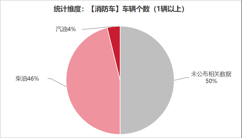 本次公告中的26款消防車中,柴油(12輛,占比46.2%)、汽油(1輛,占比3.8%)、未公布相關(guān)數(shù)據(jù)(13輛,占比50.0%)。