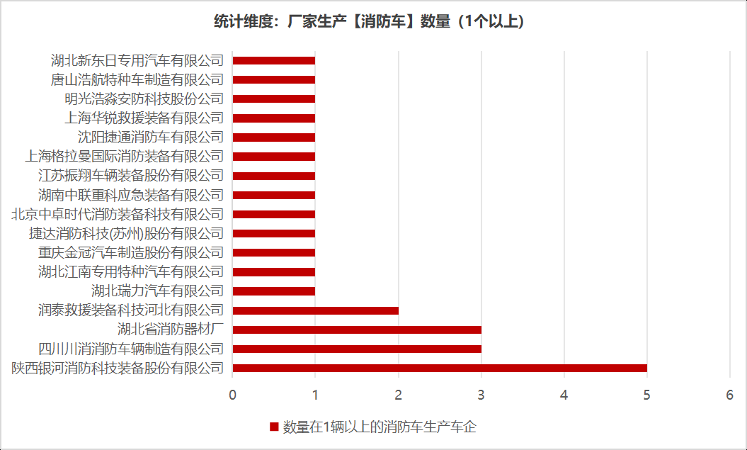 本次公告中的26款消防車的生產(chǎn)企業(yè)共有17家,陜西銀河消防科技裝備股份有限公司(5輛)、四川川消消防車輛制造有限公司(3輛)、湖北省消防器材廠(3輛)、潤泰救援裝備科技河北有限公司(2輛)、湖北瑞力汽車有限公司(1輛)、湖北江南專用特種汽車有限公司(1輛)、重慶金冠汽車制造股份有限公司(1輛)、捷達消防科技(蘇州)股份有限公司(1輛)、北京中卓時代消防裝備科技有限公司(1輛)、湖南中聯(lián)重科應(yīng)急裝備有限公司(1輛)、江蘇振翔車輛裝備股份有限公司(1輛)、上海格拉曼國際消防裝備有限公司(1輛)、上海格拉曼國際消防裝備有限公司(1輛)、上海華銳救援裝備有限公司(1輛)、明光浩淼安防科技股份公司(1輛)、唐山浩航特種車制造有限公司(1輛)、湖北新東日專用汽車有限公司(1輛)。
