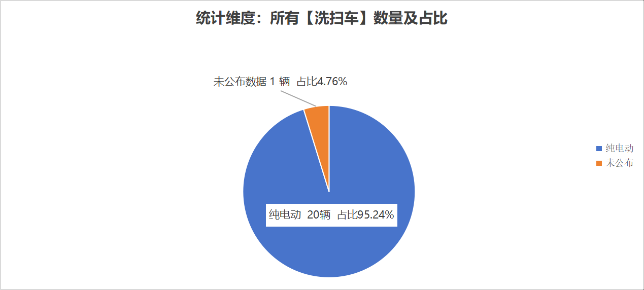本次公告中的21款洗掃車中,純電動(dòng)洗掃車(20輛,占比95.24%)、未公布能源情況(1輛,占比4.76%)。