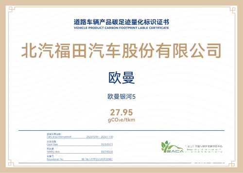福田歐曼銀河5碳足跡量化標(biāo)識(shí)證書