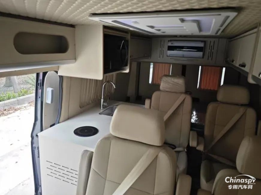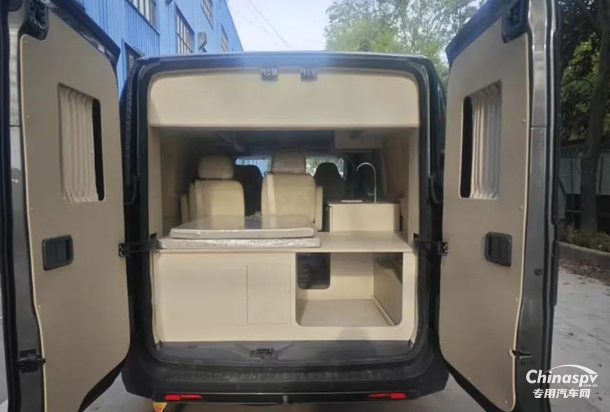 內(nèi)部的設(shè)計(jì)也挺不錯(cuò),新車(chē)采用提供四座/五座布局,除去駕駛室的座椅外,后排生活區(qū)區(qū)的座椅則與后方家具鏈接在一起,預(yù)計(jì)放倒靠背就能拓展尾床尺寸。生活區(qū)左右兩側(cè)分別提供了小尺寸的側(cè)邊柜,一側(cè)隱藏著餐桌,一側(cè)可以作為廚房使用。