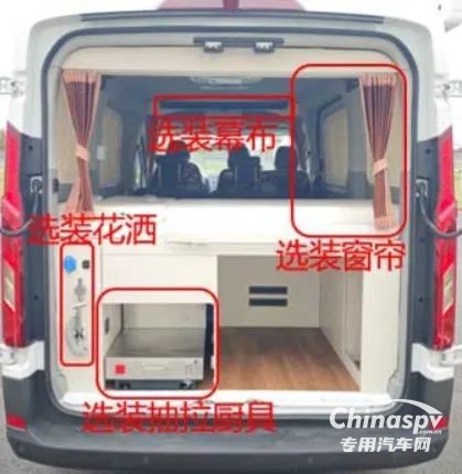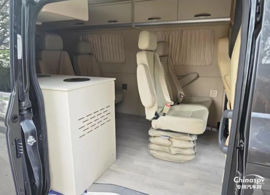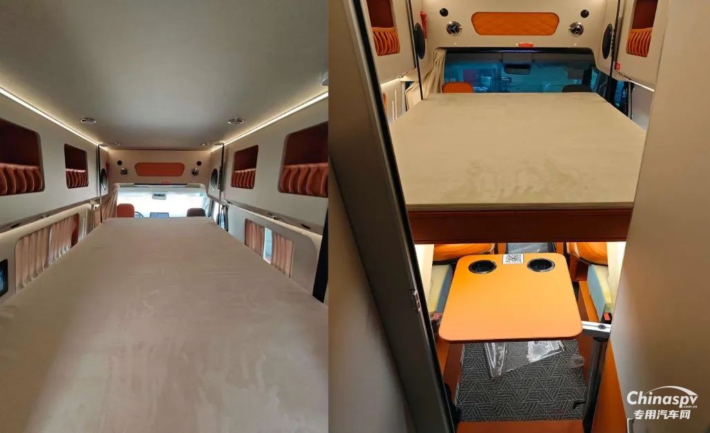 尾部則采用的是一張橫置床鋪,下方預(yù)留有儲(chǔ)物空間,個(gè)人猜測(cè)床板掀起后下方空間還可以作為簡(jiǎn)單淋浴使用,除此以外也可以看到車(chē)內(nèi)加裝了吊柜、空調(diào)、內(nèi)飾軟包等設(shè)施。