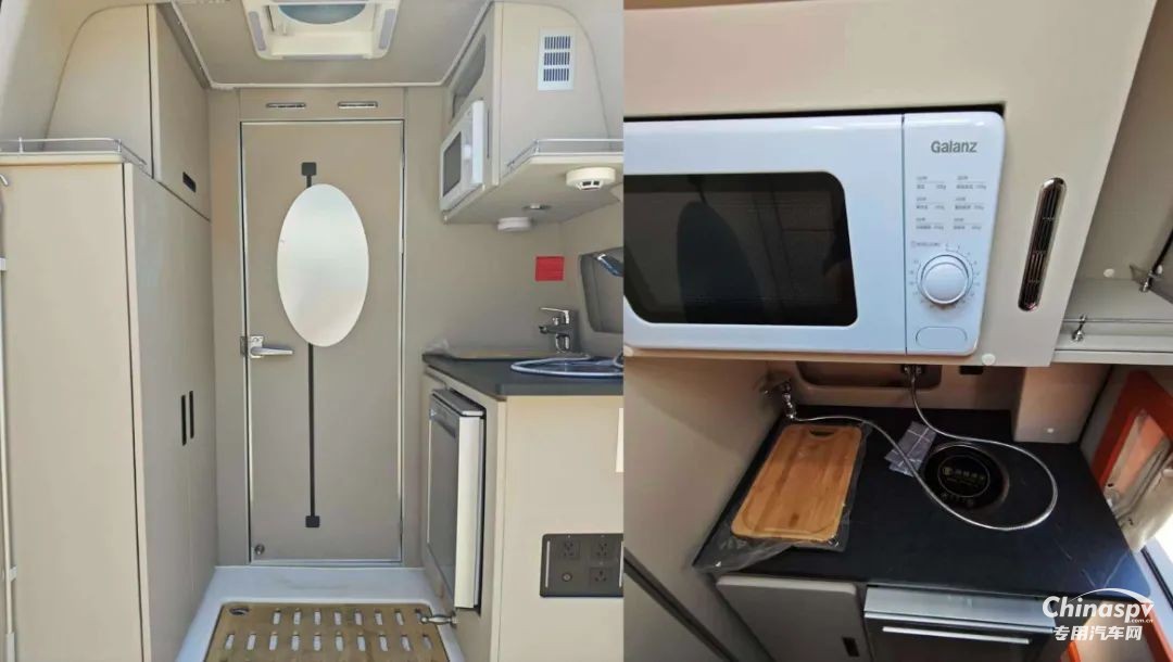 車(chē)尾部則是廚房以及儲(chǔ)物的區(qū)域,通過(guò)封閉門(mén)可以打造成前后兩個(gè)獨(dú)立空間,另外也可以看到后方空間地板上預(yù)留有排水口,也就意味著簡(jiǎn)單沖洗也沒(méi)問(wèn)題。