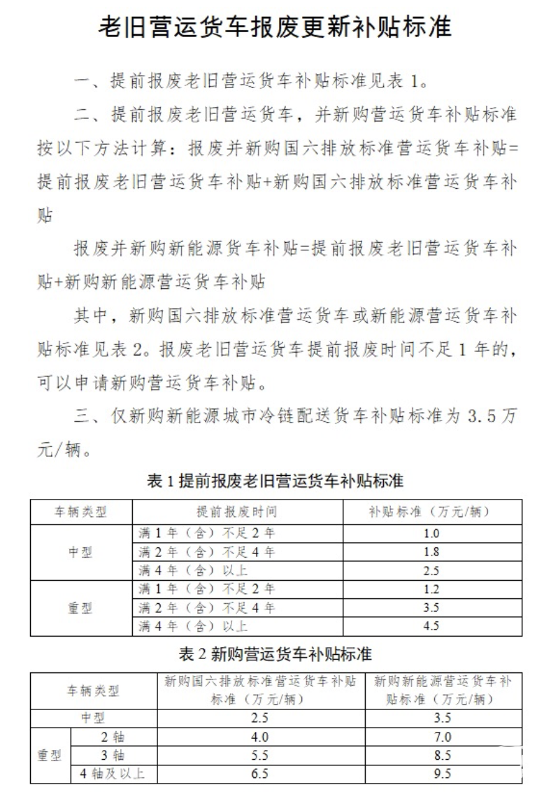 支持國三、國四排放標準營運貨車報廢更新,加快更新一批高標準低排放營運貨車。對提前報廢老舊營運貨車、提前報廢并更新購置國六排放標準貨車或新能源貨車、僅新購符合條件的新能源貨車,按照報廢車輛類型、提前報廢時間和新購置車輛動力類型等,實施差別化補貼標準(見附件1)。 上述補貼政策實施期限為2025年1月1日至2025年12月31日(報廢貨車《報廢機動車回收證明》《機動車注銷證明》日期、新購置貨車《機動車行駛證》注冊登記日期和《道路運輸證》發(fā)放日期均應在政策實施期內(nèi))
