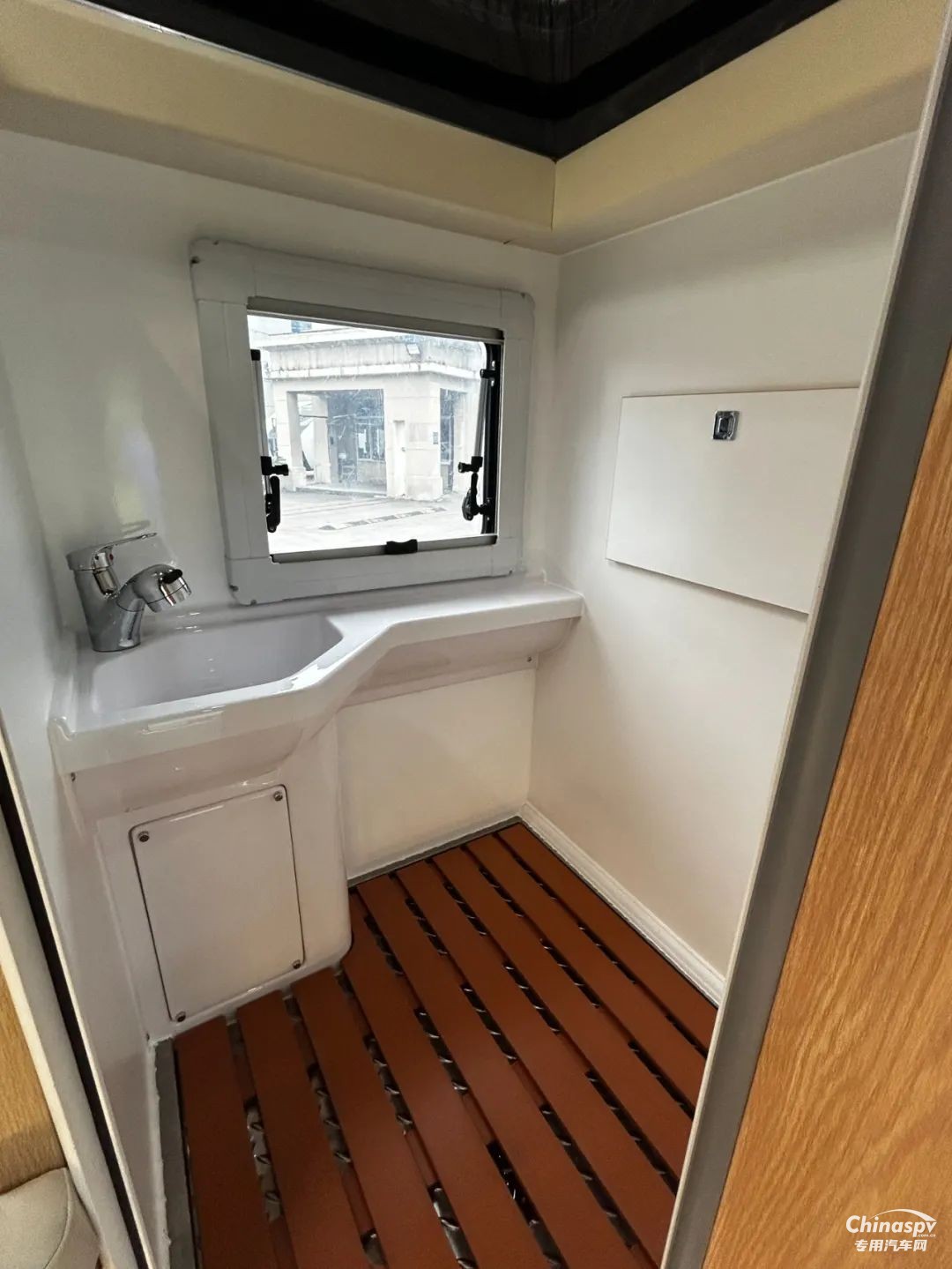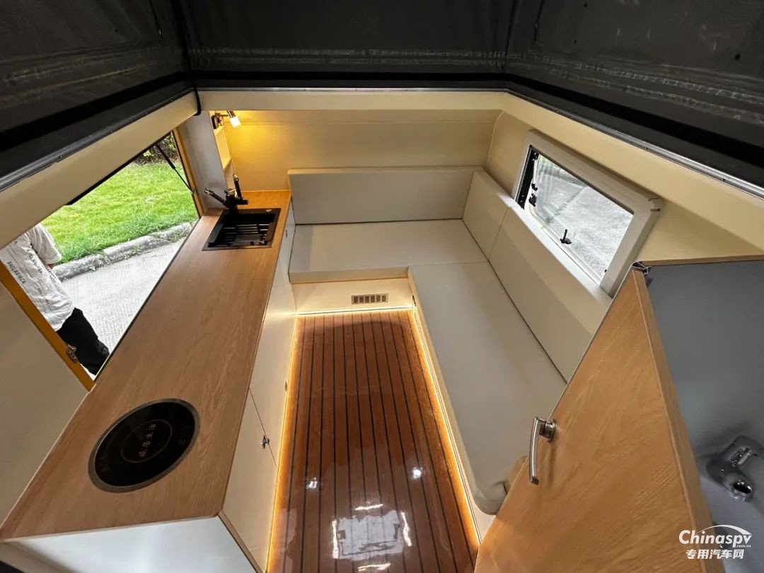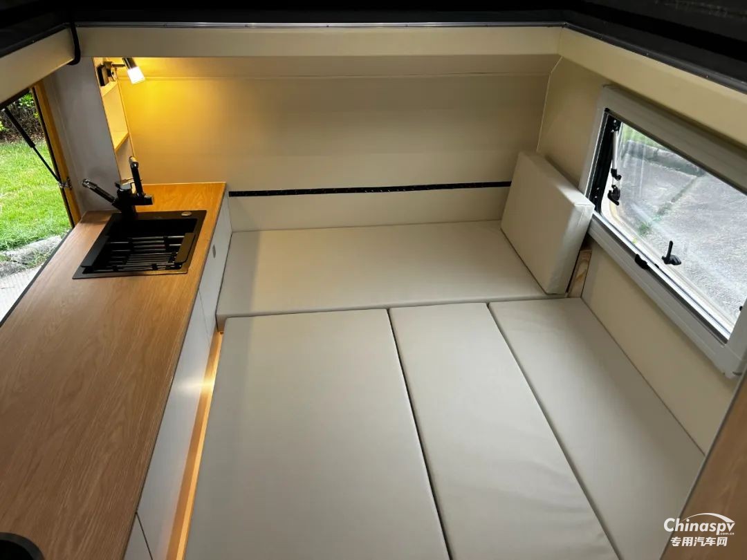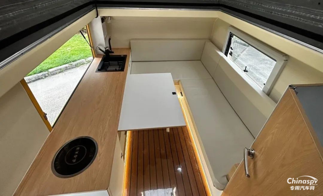 前部功能區(qū)配有空調(diào)、冰箱、集成控制面板、水位顯示器和電動升頂控制開關(guān)。衛(wèi)生間還貼心設(shè)置一暗格,以便洗漱用品存取。