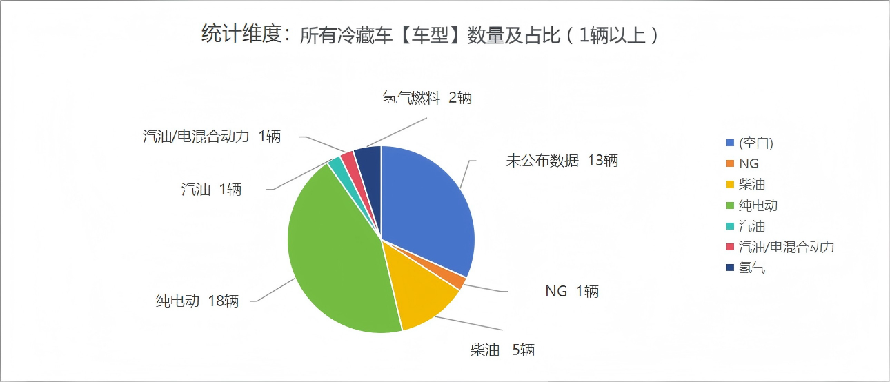 本次公告中的41款冷藏車中,燃料選擇采用柴油的(20輛)、采用NG的(1輛)、采用純電能源的(18輛)、采用汽油的(1輛)、采用汽油/電混合動(dòng)力的(1輛)、采用氫氣的(1輛)、未公布能源情況(13輛)。