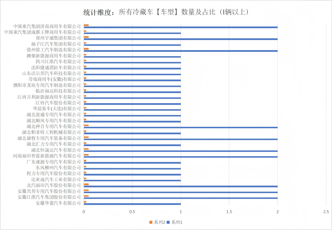 本次公告中的22款冷藏車的底盤生產(chǎn)企業(yè)共有25家,安徽華菱汽車有限公司(1輛)、安徽江淮汽車集團(tuán)股份有限公司(2輛)、北京福田戴姆勒汽車有限公司(2輛)、北汽福田汽車股份有限公司(4輛)、比亞迪汽車工業(yè)有限公司(2輛)、東風(fēng)柳州汽車有限公司(1輛)、東風(fēng)商用車有限公司(1輛)、廣西汽車集團(tuán)有限公司(1輛)、河南福田智藍(lán)新能源汽車有限公司(2輛)、江鈴汽車股份有限公司(2輛)、江西吉利新能源商用車有限公司(1輛)、南京汽車集團(tuán)有限公司(1輛)、奇瑞商用車(安徽)有限公司(1輛)、慶鈴汽車股份有限公司(1輛)、山東唐駿歐鈴汽車制造有限公司(2輛)、上汽通用五菱汽車股份有限公司(1輛)、四川江淮汽車有限公司(1輛)、濰柴新能源商用車有限公司(1輛)、鑫源汽車有限公司(1輛)、徐州徐工汽車制造有限公司(2輛)、鄭州宇通集團(tuán)有限公司(2輛)、中國(guó)重汽集團(tuán)成都王牌商用車有限公司(1輛)、中國(guó)重汽集團(tuán)濟(jì)南卡車股份有限公司(2輛)、中國(guó)重汽集團(tuán)濟(jì)南商用車有限公司(4輛)、中國(guó)重汽集團(tuán)濟(jì)寧商用車有限公司(1輛)。