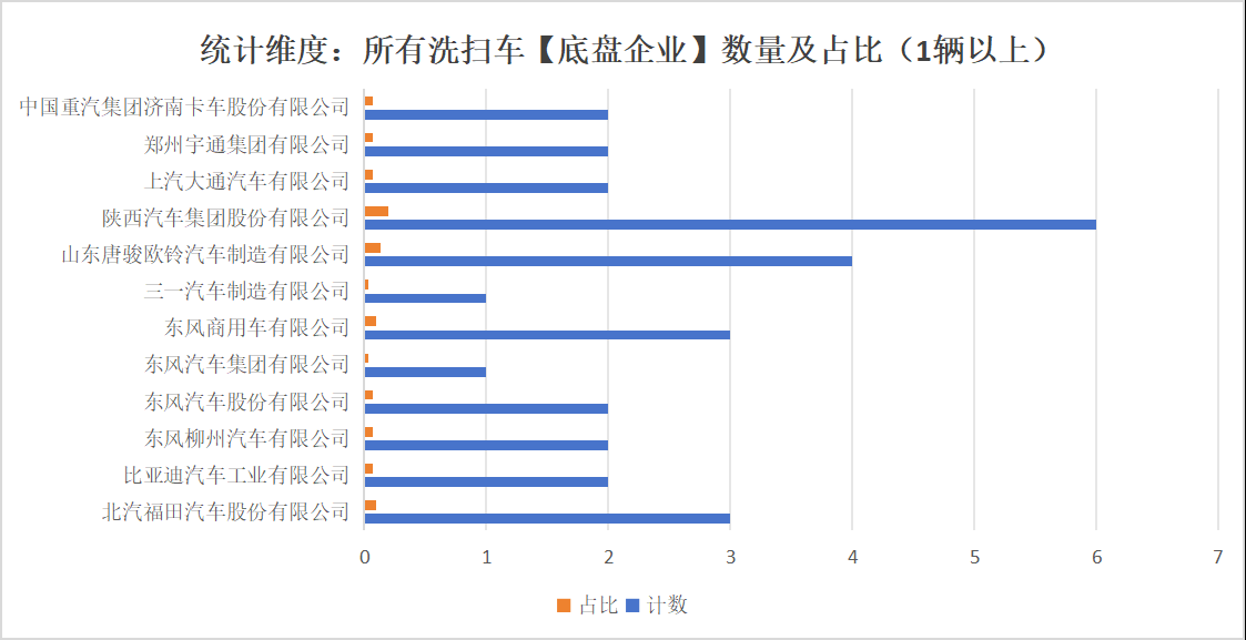 本次公告中的30款洗掃車(chē)的底盤(pán)生產(chǎn)企業(yè)共有12家,北汽福田汽車(chē)股份有限公司(3輛,占比10.0%)、比亞迪汽車(chē)工業(yè)有限公司(2輛,占比6.7%)、東風(fēng)柳州汽車(chē)有限公司(2輛,占比6.7%)、東風(fēng)汽車(chē)股份有限公司(2輛,占比6.7%)、東風(fēng)汽車(chē)集團(tuán)有限公司(1輛,占比3.3%)、東風(fēng)商用車(chē)有限公司(3輛,占比10.0%)、三一汽車(chē)制造有限公司(1輛,占比3.3%)、山東唐駿歐鈴汽車(chē)制造有限公司(4輛,占比13.3%)、陜西汽車(chē)集團(tuán)股份有限公司(6輛,占比20.0%)、上汽大通汽車(chē)有限公司(2輛,占比6.7%)、鄭州宇通集團(tuán)有限公司(2輛,占比6.7%)、中國(guó)重汽集團(tuán)濟(jì)南卡車(chē)股份有限公司(2輛,占比6.7%)。本次公告中的30款洗掃車(chē)中,均采用二類底盤(pán)。