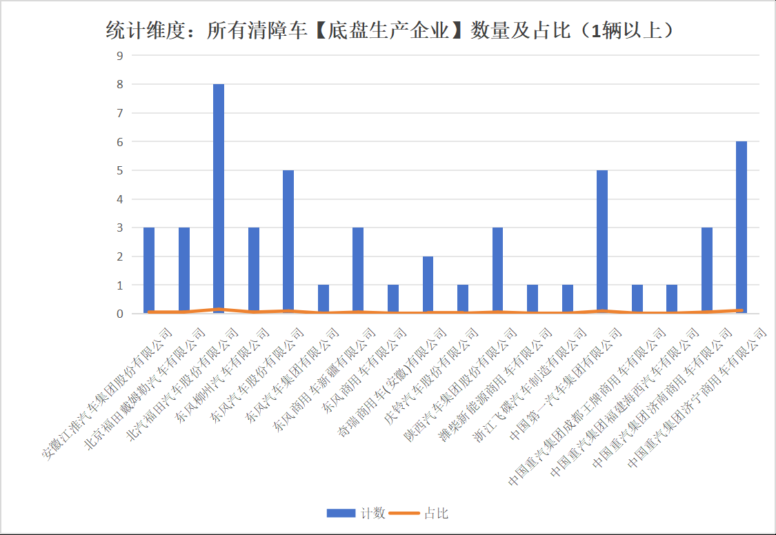 本次公告中的51款清障車的底盤生產(chǎn)企業(yè)共有18家,安徽江淮汽車集團股份有限公司(3輛)、北京福田戴姆勒汽車有限公司(3輛)、北汽福田汽車股份有限公司(8輛)、東風(fēng)柳州汽車有限公司(3輛)東風(fēng)汽車股份有限公司(5輛)、東風(fēng)汽車集團有限公司(1輛、東風(fēng)商用車新疆有限公司(3輛)、東風(fēng)商用車有限公司(1輛)、奇瑞商用車(安徽)有限公司(2輛)、慶鈴汽車股份有限公司(1輛)、陜西汽車集團股份有限公司(3輛)、濰柴新能源商用車有限公司(1輛)、浙江飛碟汽車制造有限公司(1輛)、中國第一汽車集團有限公司(5輛)、中國重汽集團成都王牌商用車有限公司(1輛)、中國重汽集團福建海西汽車有限公司(1輛)、中國重汽集團濟南商用車有限公司(3輛)、中國重汽集團濟寧商用車有限公司(6輛)。本次公告中的51款清障車中,均采用二類底盤。