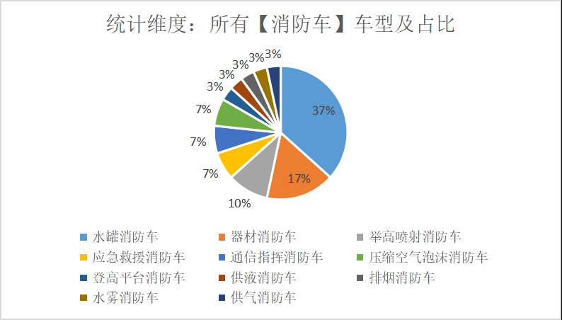本次公告中的30款消防車的車型共有11種,水罐消防車(11輛)、器材消防車(5輛)、舉高噴射消防車(3輛)、應(yīng)急救援消防車(2輛)、通信指揮消防車(2輛)、壓縮空氣泡沫消防車(2輛)、登高平臺(tái)消防車(1輛)、供液消防車(1輛)、排煙消防車(1輛)、水霧消防車(1輛)、供氣消防車(1輛)。