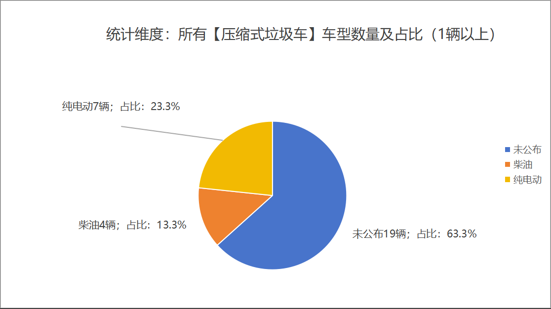 本次公告中的30款垃圾車中,柴油(4輛,占比13.3%)、純電動(7輛,占比23.3%)、未公布相關(guān)數(shù)據(jù)(19輛,占比63.3%)。